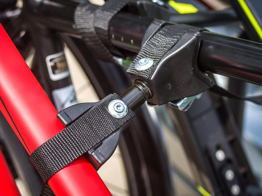 Les vélos sont installés sur des rails en acier réglables et sont fixés grâce à des fixe-cadres et sangles. Cela permet un transport en toute sécurité sans endommager les vélos.