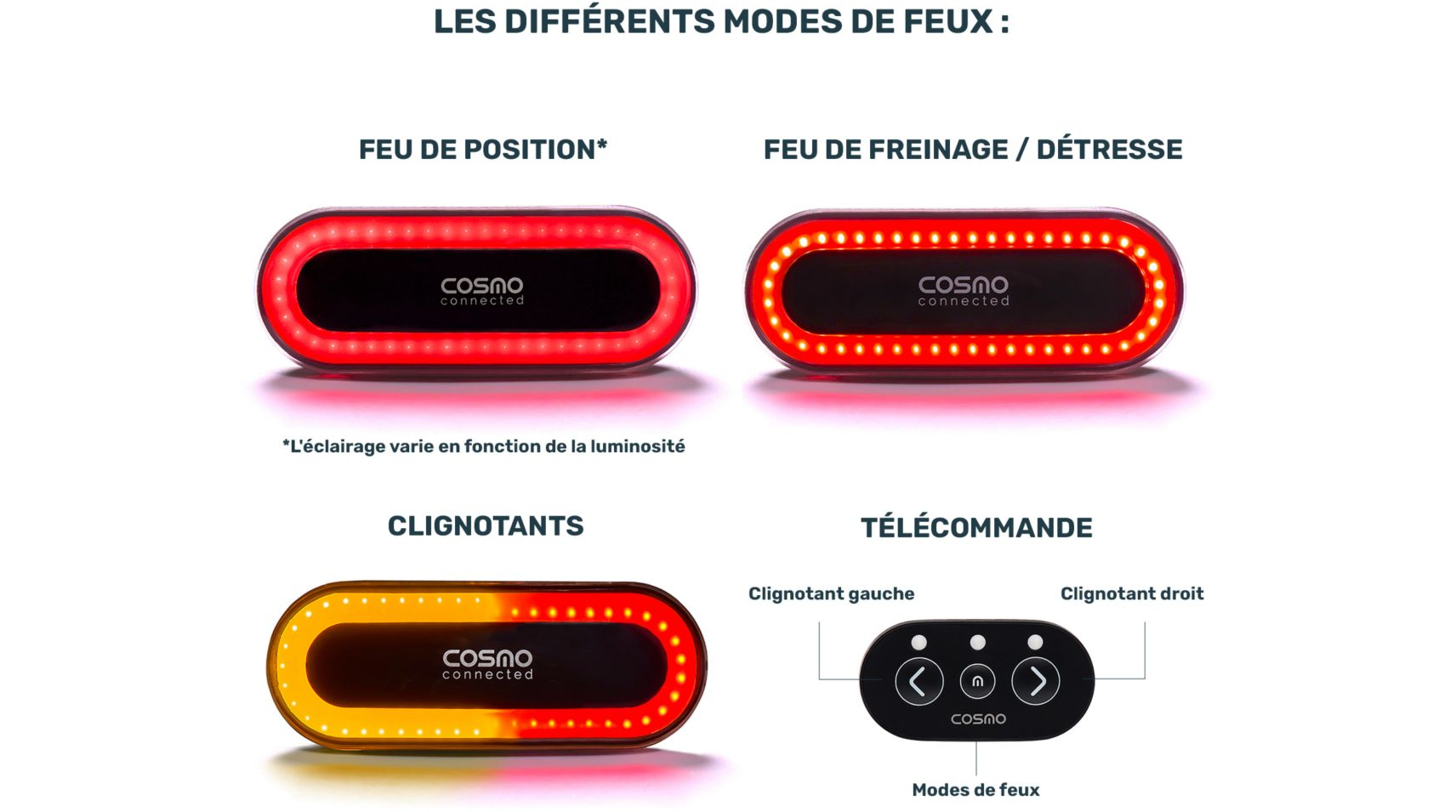 Le COSMO RIDE est relié et se commande grâce à une télécommande sans fil placé au niveau du guidon. La lampe et la télécommande se connectent à une application mobile qui va permettre d'appairer tous les dispositifs ensembles.